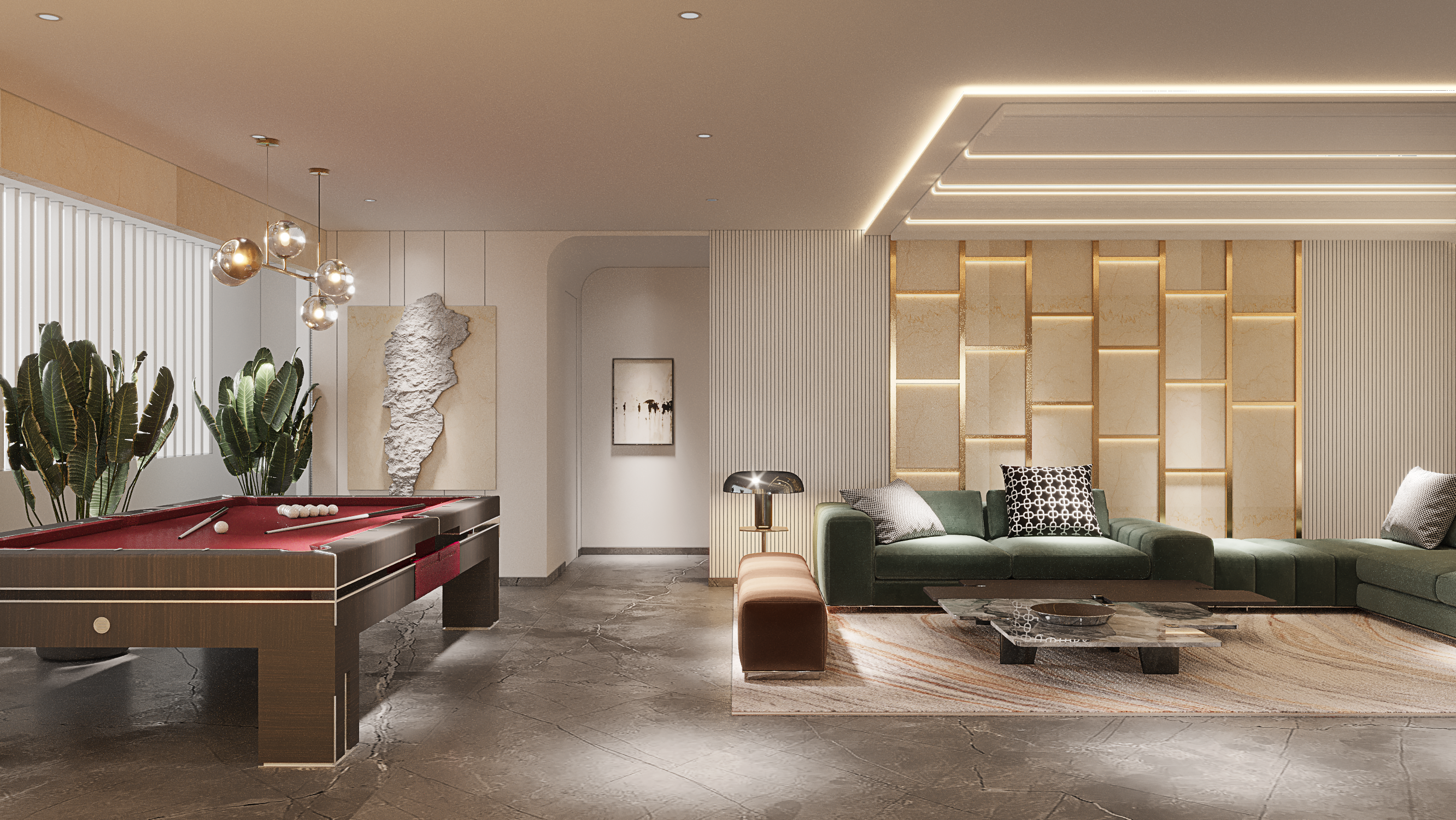 Executive Oasis is a luxurious home office interior design project that seamlessly blends sophistication with functionality. The space features a modern aesthetic with muted colours and gray tones, complemented by wood and black metal accents. Short windows allow artificial lights to create drama in the entire space. This reflects a den and cozy environment conducive to productivity. Ergonomic furniture and biophilic design elements, such as indoor plants, enhance comfort and well-being.
