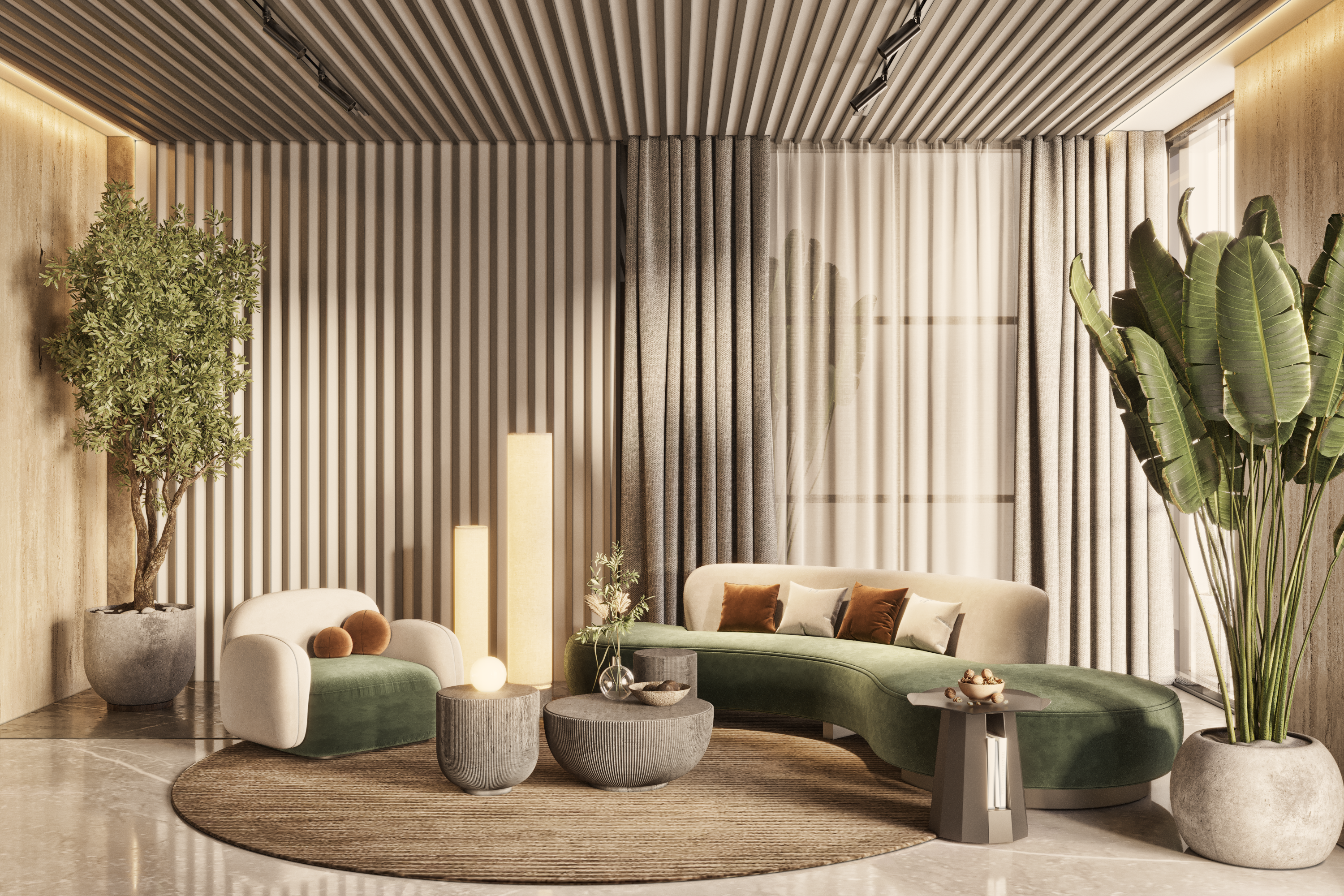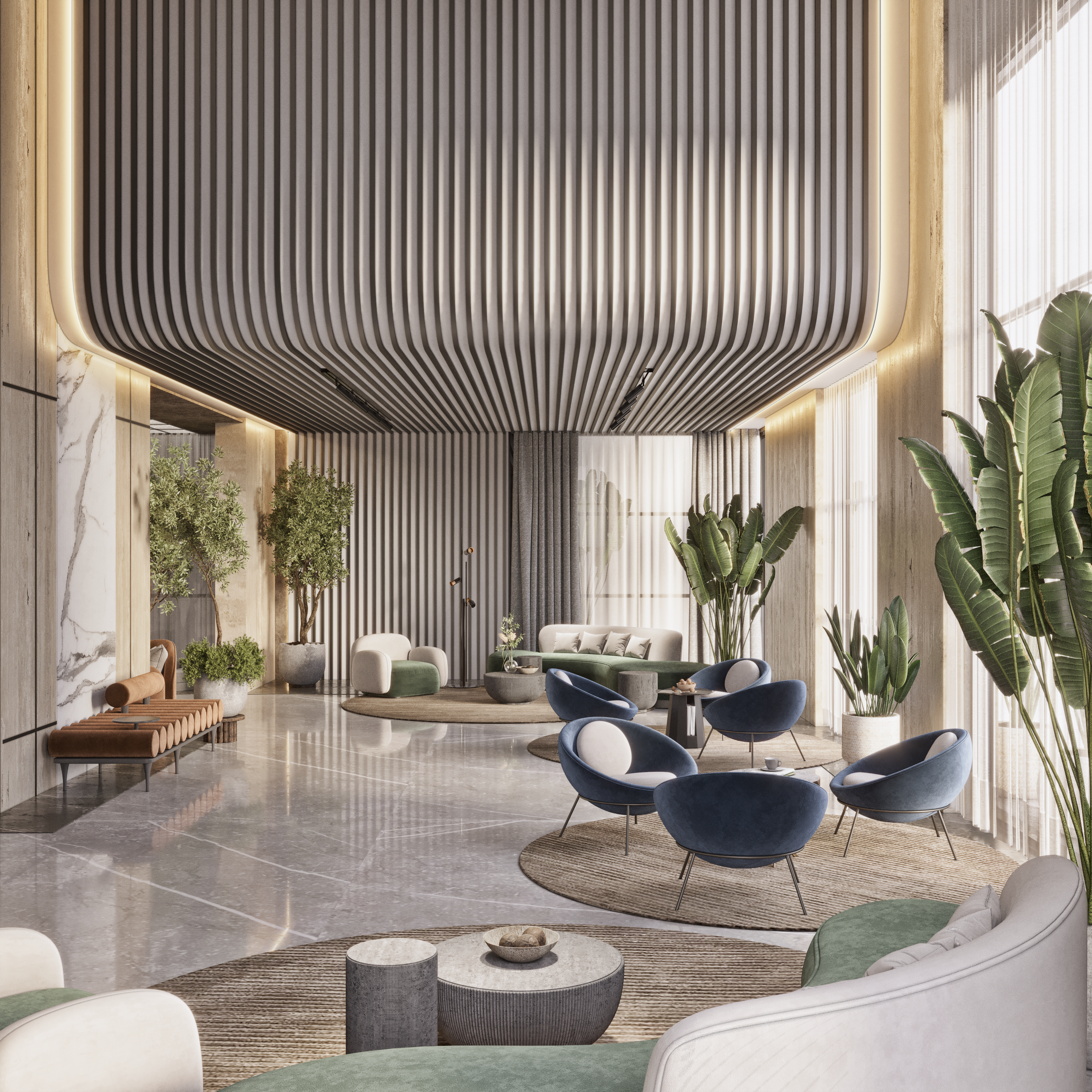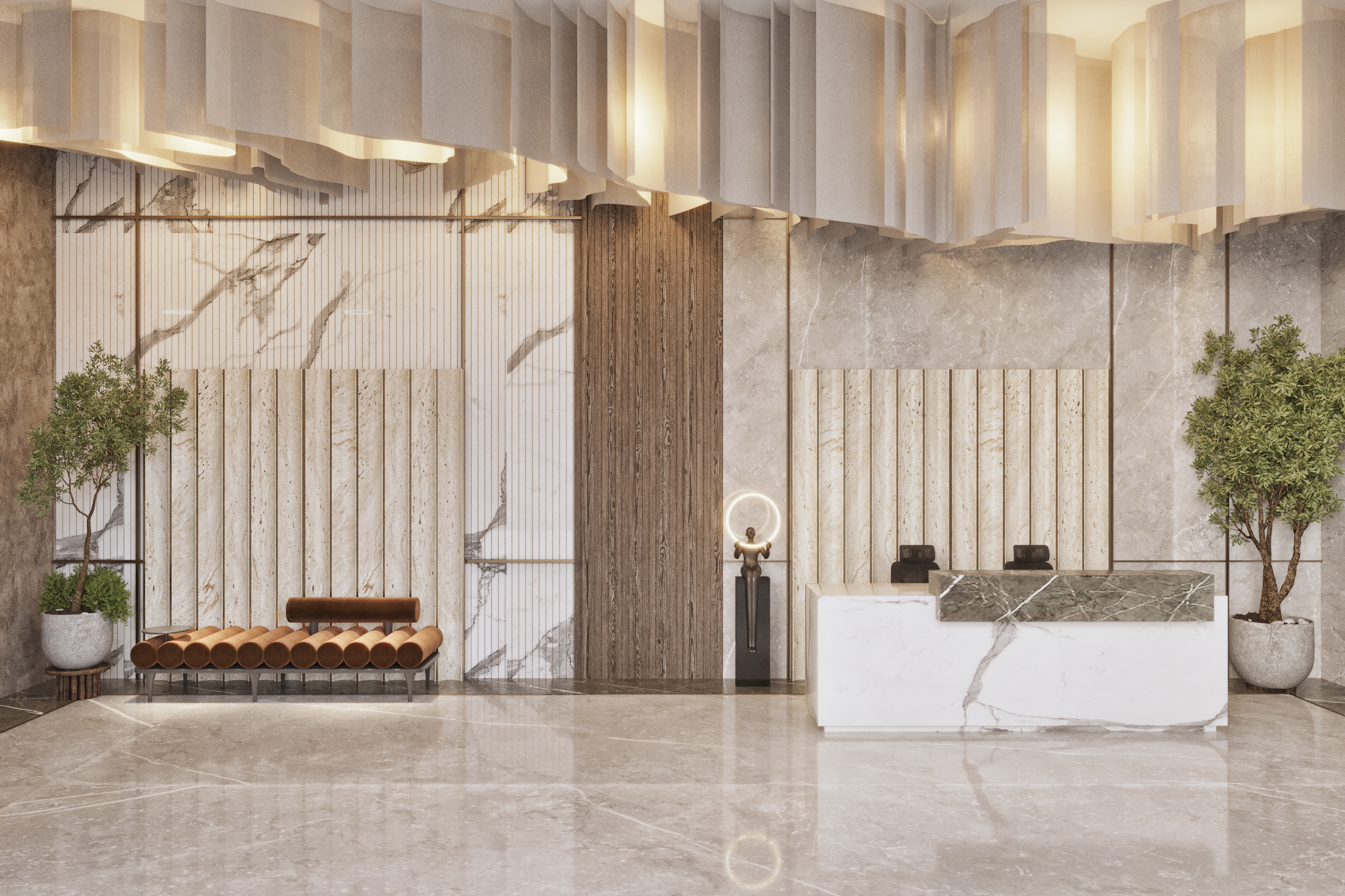 Opulent in form, grounded in nature, this residential lobby is envisioned as a warm embrace—crafted with rich textures, flowing light, and earthy elegance.