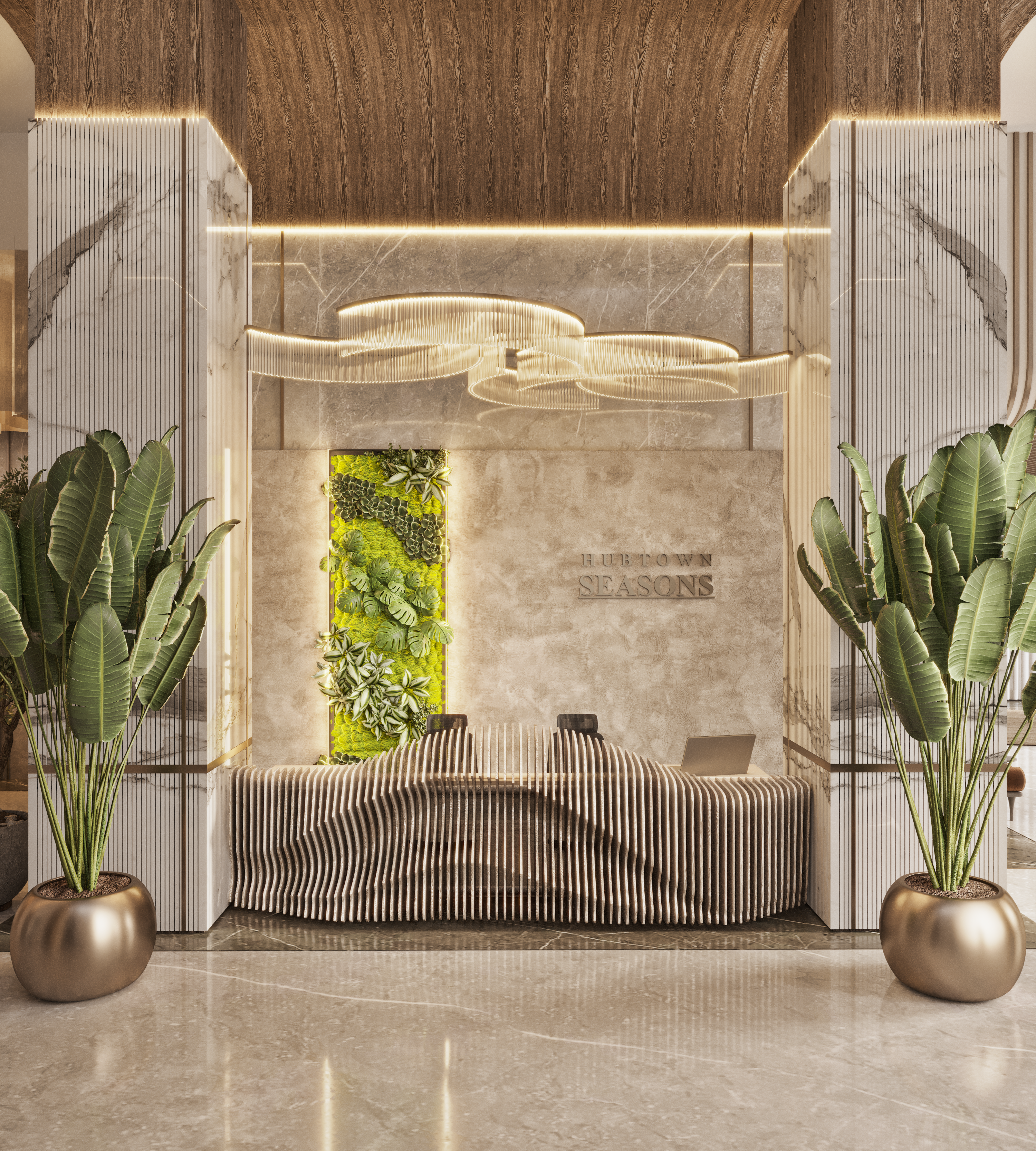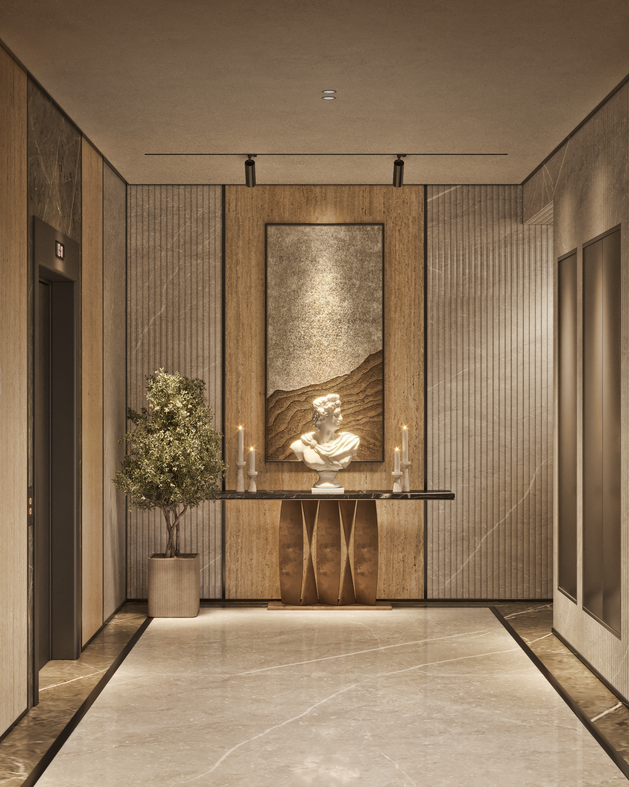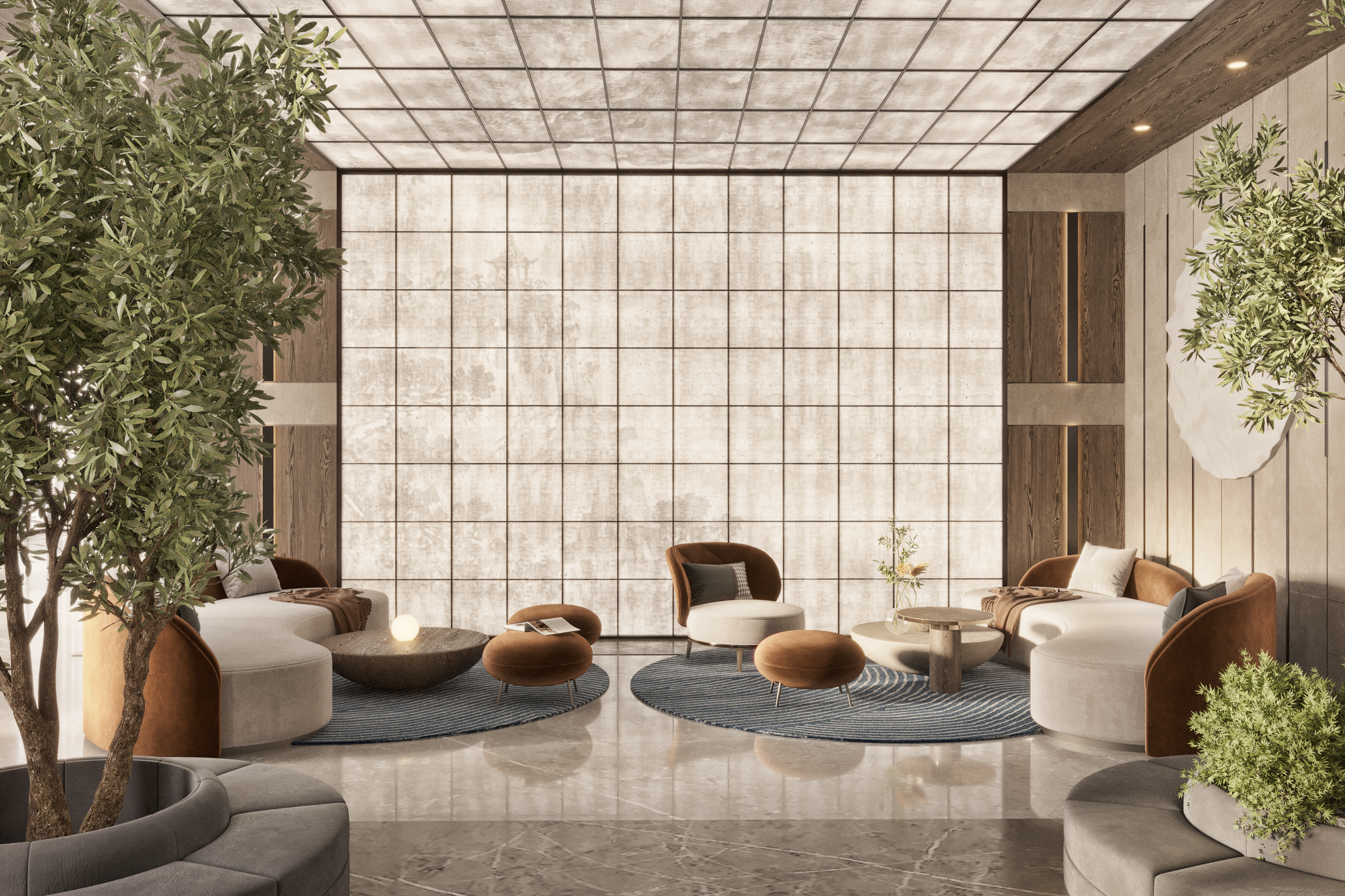 Opulent in form, grounded in nature, this residential lobby is envisioned as a warm embrace—crafted with rich textures, flowing light, and earthy elegance.
