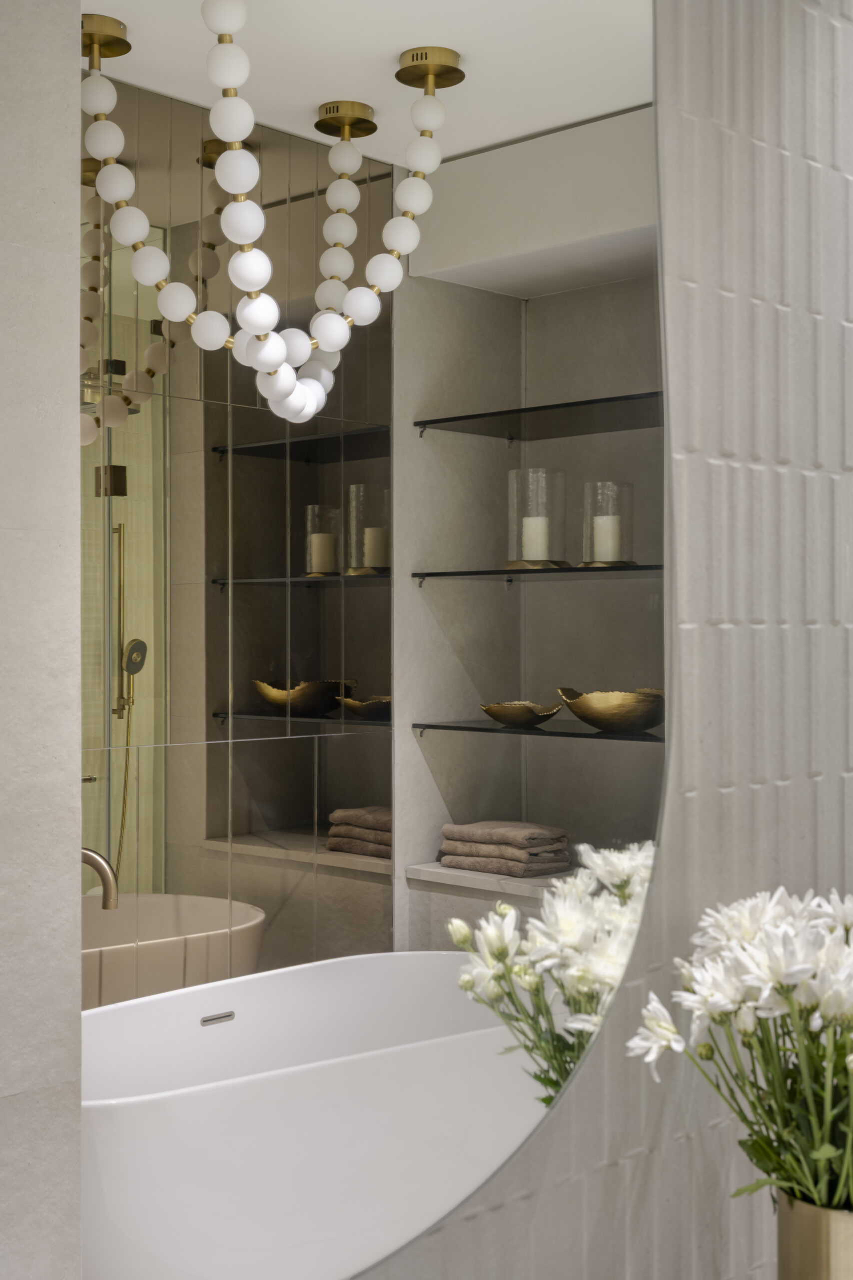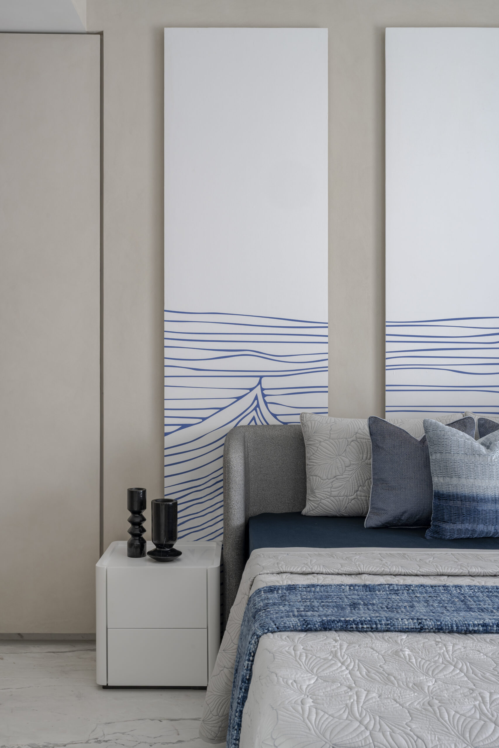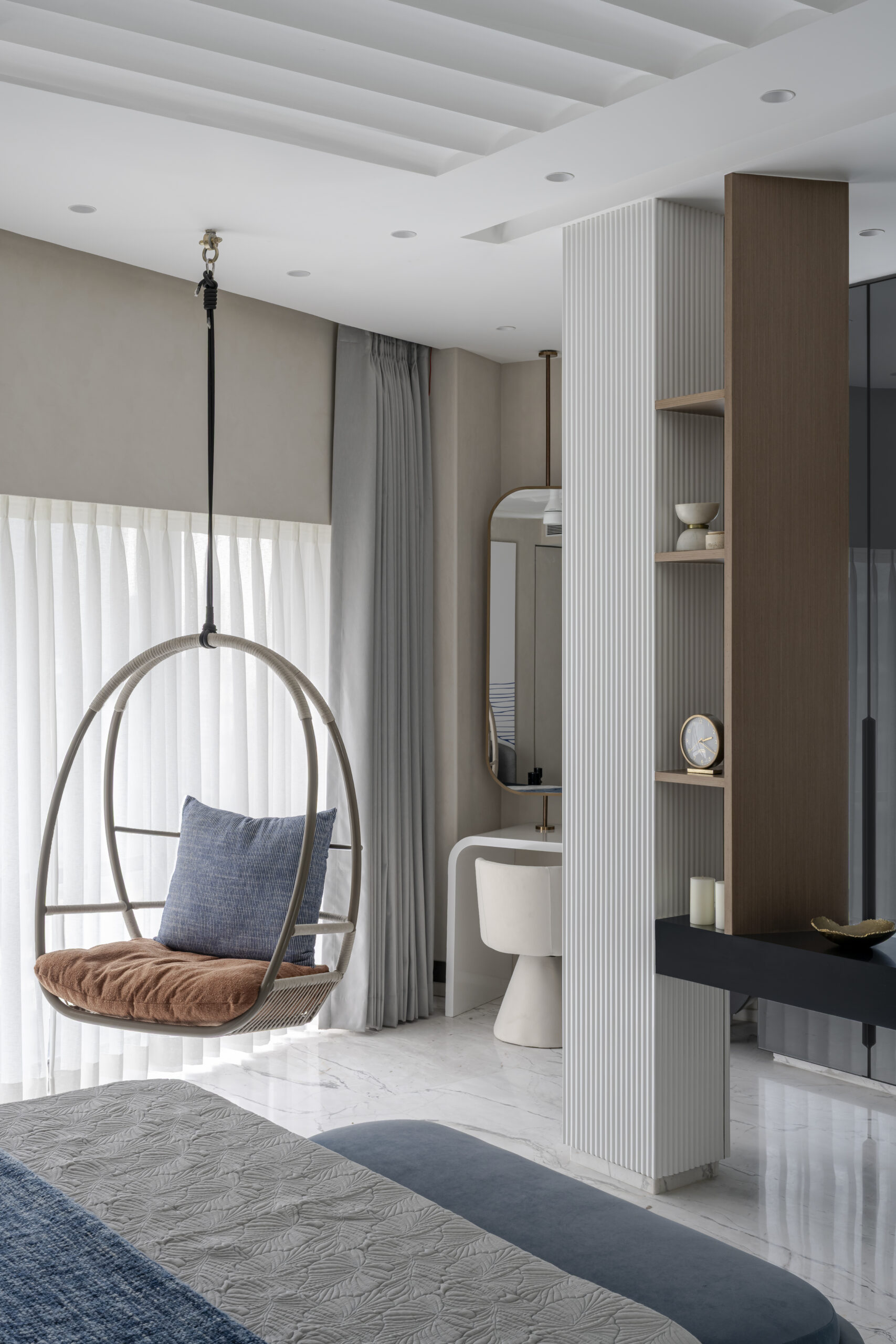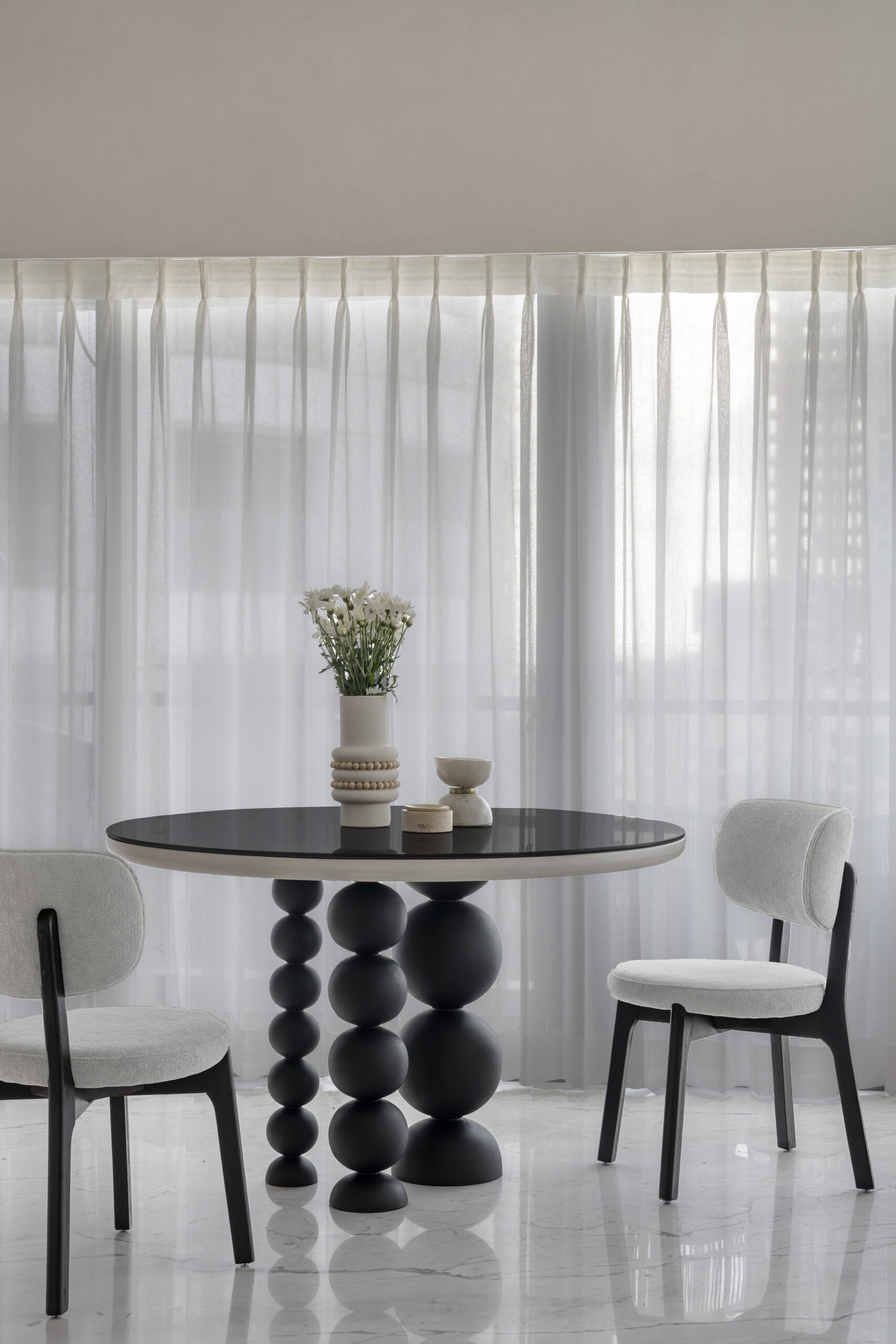 Monochrome tones form the foundation of the home, setting a calm, timeless canvas. Against this, gentle bursts of color—powder pink, muted blues, and soft earthy notes—appear thoughtfully, almost like whispers of personality woven through the design. Each space houses a focal moment: sculptural decorative lighting, a pebble-shaped sofa, immersive acoustics from a high-end music system, smart home automation, and a serene bathtub that turns routine into ritual.