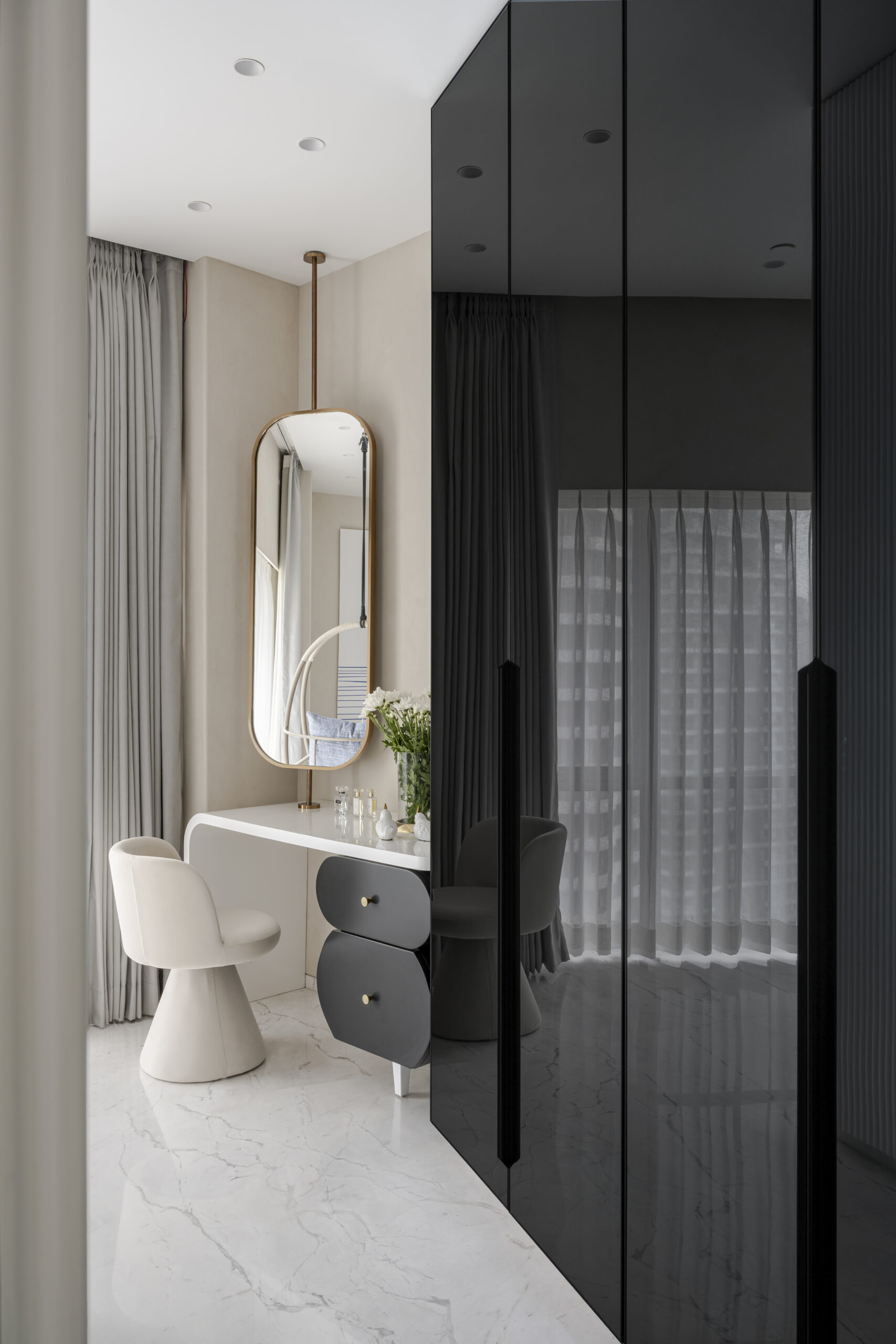 This residence is crafted for modern living: a place where hosting friends feels fluid, where a toddler can move freely, and where every corner reveals a quiet sophistication. The layout celebrates openness, with intentionally minimal furniture allowing volume, light, and flow to take center stage. Large surfaces in PU, subtle touches of veneer, expanses of glass, and delicately placed mirrors come together to shape a palette that is sleek yet warm, polished yet intimately lived-in.